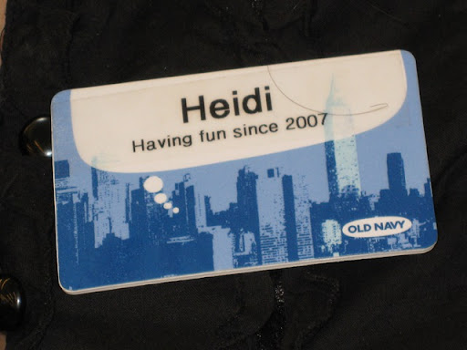 Old Navy is marketing that they want their employees to have fun doing their work. Heidi allowed me to snap a photo of her name tag to provide evidence that some companies do indeed intend for their employees to enjoy their work. Heidi didn't really look like she was having fun when I took this photo. She was having a problem trying to process a return that was originally bought online, and she couldn't figure out how to get the cash register to do what she needed it to do. I'm not sure why she didn't call for rescue from one of the fun managers, but she didn't.