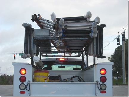 So I'm driving down the road this morning and I end up at a red light behind a truck with rag-wrapped ladder ends. For years, I've noticed that painters do this! It's just one of those obvious things that jumps out at me because it doesn't look right. It's jimmy rigged! Painters don't want to damage the interior or exterior walls their ladders lean on, so they cushion the ends of their ladders. Since I'm behind the truck at a long light, I have time to have a brief conversation with myself. Haven't the ladder manufactures talked to their customers in the past decade or two, I wonder? Don't the Home Depot guys say something to the ladder distributors about the fact that all the paint guys come in and buy rags and tape with their ladders?