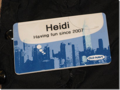 Old Navy is marketing that they want their employees to have fun doing their work. Heidi allowed me to snap a photo of her name tag to provide evidence that some companies do indeed intend for their employees to enjoy their work. Heidi didn't really look like she was having fun when I took this photo. She was having a problem trying to process a return that was originally bought online, and she couldn't figure out how to get the cash register to do what she needed it to do. I'm not sure why she didn't call for rescue from one of the fun managers, but she didn't.